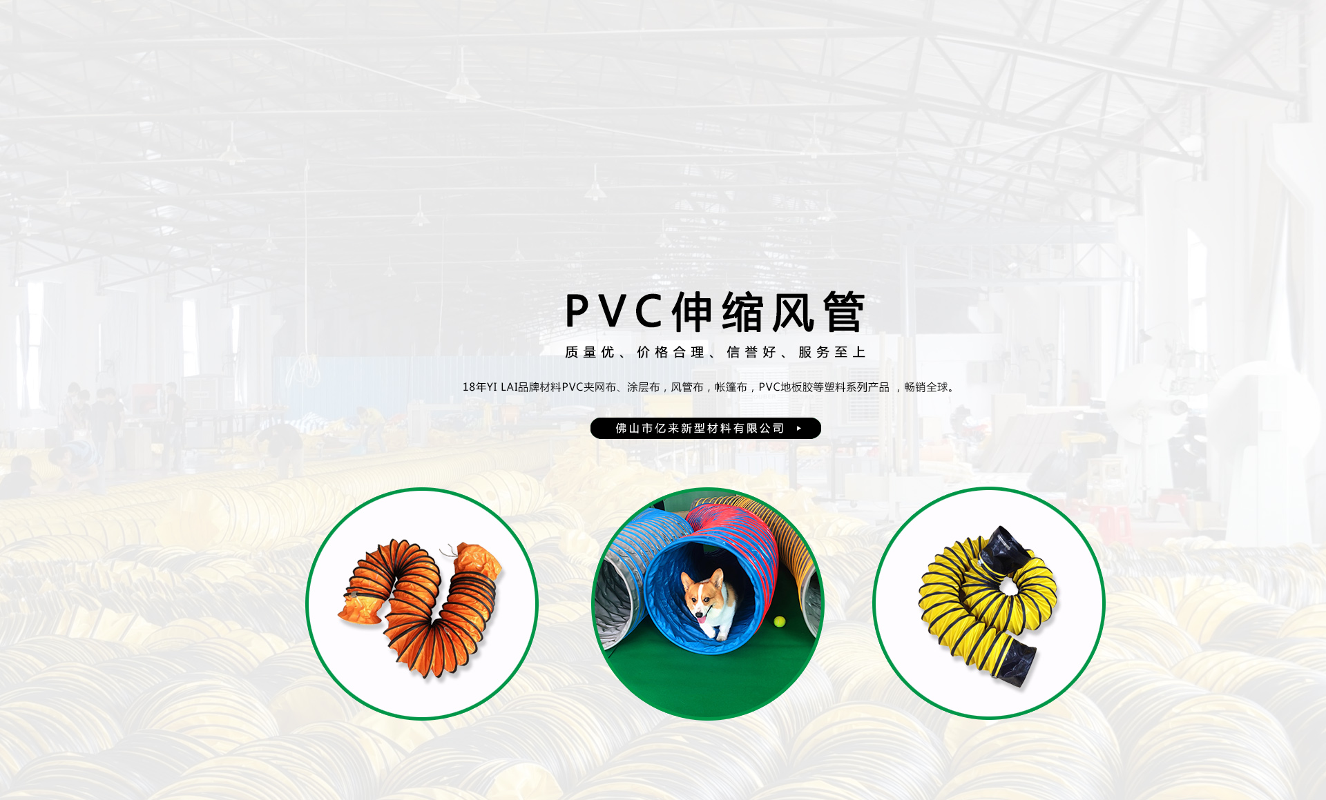 創(chuàng)建“YILAI品牌”近20年來,產品質量穩(wěn)定提高,生產及經營的產品包括PVC夾網布、PVC彩條布、PVC風管布、PVC涂層布、PVC籬笆圍護欄布、PVC透明夾網布、PVC伸縮風管、車縫風管、寵物管、耐高溫風管、地下室通風管,保溫通風管、空調排風管、正負壓通風管、三通/四通排風管、防靜電風管、隧道風管、PVC地板膠等系列產品在市場上得到廣大客戶認可,暢銷歐美、東南亞、非洲、中東等國外市場。